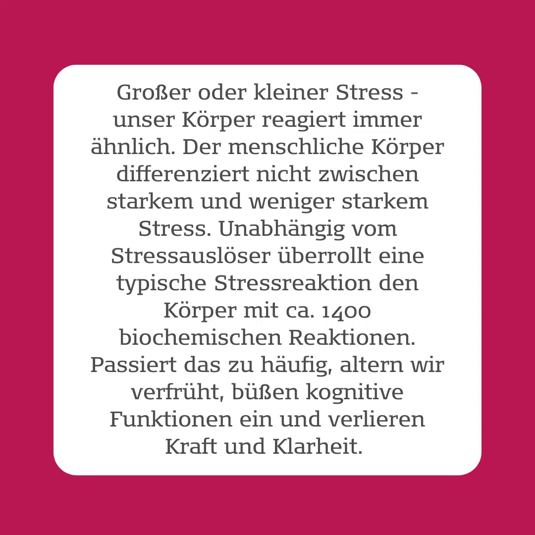 Großer oder kleiner Stress – unser Körper reagiert immer ähnlich. Der menschliche Körper differenziert nicht zwischen starkem und weniger starkem Stress. Unabhängig vom Stressauslöser überrollt eine typische Stressreaktion den Körper mit ca. 1400 biochemischen Reaktionen. Passiert das zu häufig, altern wir verfrüht, büßen kognitive Funktionen ein und verlieren Kraft und Klarheit.